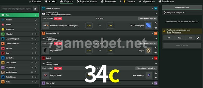 O 34c oferece uma grande seleção de opções de apostas em e-sports com probabilidades competitivas